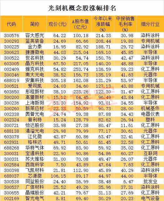 二級市場表現(xiàn)來看,今年以來已有11只光刻機概念股漲幅翻倍,包括容大感光、藍(lán)英裝備、金力泰、【捷捷微電(300623)、股吧】、世名科技、晶方科技等。容大感光累計漲幅214.33%排在首位,該公司主營業(yè)務(wù)涵蓋PCB感光油墨、光刻膠及配套化學(xué)品、特種油墨等,昨日盤中股價創(chuàng)下歷史高點,今日股價回落,收盤跌5.56%,最新市值100億元。