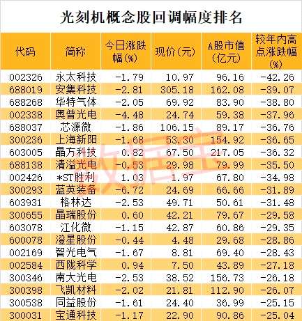不過與年內(nèi)高點相比,光刻機概念股整體回調(diào)力度不小。據(jù)統(tǒng)計,11股最新收盤價較年內(nèi)高點回調(diào)30%以上,分別是永太科技、【安集科技(688019)、股吧】、華特氣體、奧普光電、芯源微等。其中永太科技回調(diào)幅度最大,該股于2月初創(chuàng)下年內(nèi)高點,迄今回調(diào)42.26%。