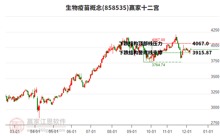 今天概念位于前期2025年10月9日形成的下跌結(jié)構(gòu)警戒線3915.87點(diǎn)與底部線3764.74點(diǎn)之間,概念自近期低點(diǎn)12月17日3720.64點(diǎn)上攻至今日3857.08,漲幅3.67%。依據(jù)贏家十二宮多空能量守恒規(guī)則,下跌結(jié)構(gòu)警戒線是多空能量平衡爭奪點(diǎn),突破或跌破往往意味著平衡打破。若近期概念能有效突破警戒線3915.87,則多方能量主導(dǎo)有望上攻,頂部線4067.0點(diǎn)尋找新的多空能量平衡位。如未能突破站穩(wěn)警戒線,空方能量可能主導(dǎo),則向下尋底部線3764.74點(diǎn)尋找多空能量平衡位。