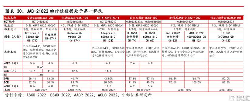 從此前發(fā)布的數(shù)據(jù)來看,JAB-21822無論是單藥及聯(lián)用都具有安全性和有效性優(yōu)勢,中郵證券稱“JAB-21822的療效數(shù)據(jù)處于第一梯隊”。根據(jù)2022年ASCO年會公布的數(shù)據(jù)顯示,在針對晚期非小細胞肺癌患者的臨床中,ORR為56.3%,DCR為90.6%。2022年ESMO ASIA會議發(fā)布的數(shù)據(jù)顯示,JAB-21822與加科思研發(fā)的SHP2抑制劑JAB-3312聯(lián)合用藥有望克服腫瘤患者對KRAS G12C抑制劑的適應(yīng)性耐藥。JAB-3312是全球唯一的二代SHP2抑制劑,已于2020年以近10億美元的價格授權(quán)給艾伯維,SHP2抑制劑是夠克服KRAS G12C抑制劑耐藥的最佳聯(lián)合用藥搭檔,同時在增加PD-1響應(yīng)率等領(lǐng)域有較大的市場潛力。