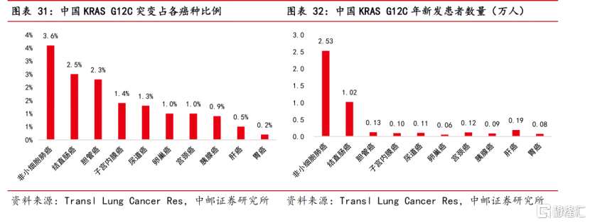 目前國內(nèi)暫無KRAS G12C抑制劑獲批,帶有這一基因突變的患者暫時沒有靶向藥可用。中郵證劵結(jié)合發(fā)病率測試,KRAS G12C在中國和美國的市場潛力分別為27億元和190億元。