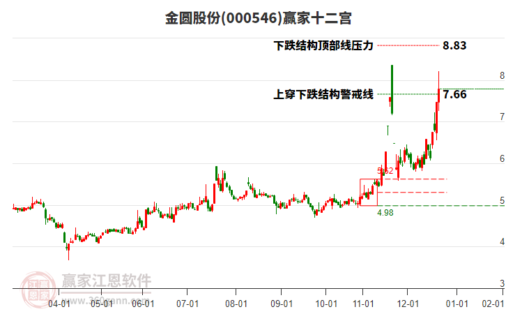 12月25日股價下穿前期2024年2月8日形成的下跌結(jié)構(gòu)頂部線,以下影陽線收盤,跌幅4.35%,近期高點(diǎn)為12月22日,跌至今日,持續(xù)3天,跌幅20.38%。依據(jù)贏家十二宮多空能量守恒規(guī)則,當(dāng)前股價下跌若不能收復(fù)下跌結(jié)構(gòu)頂部線7.05,多方能量持續(xù)萎縮,空方動能充足,將會進(jìn)一步下探警戒線5.76,若能再次收復(fù)下跌結(jié)構(gòu)頂部線,有望再度展開上攻。