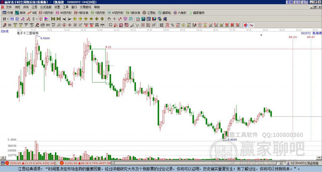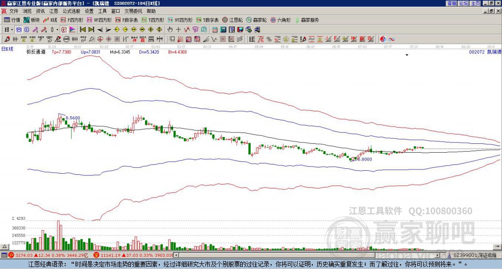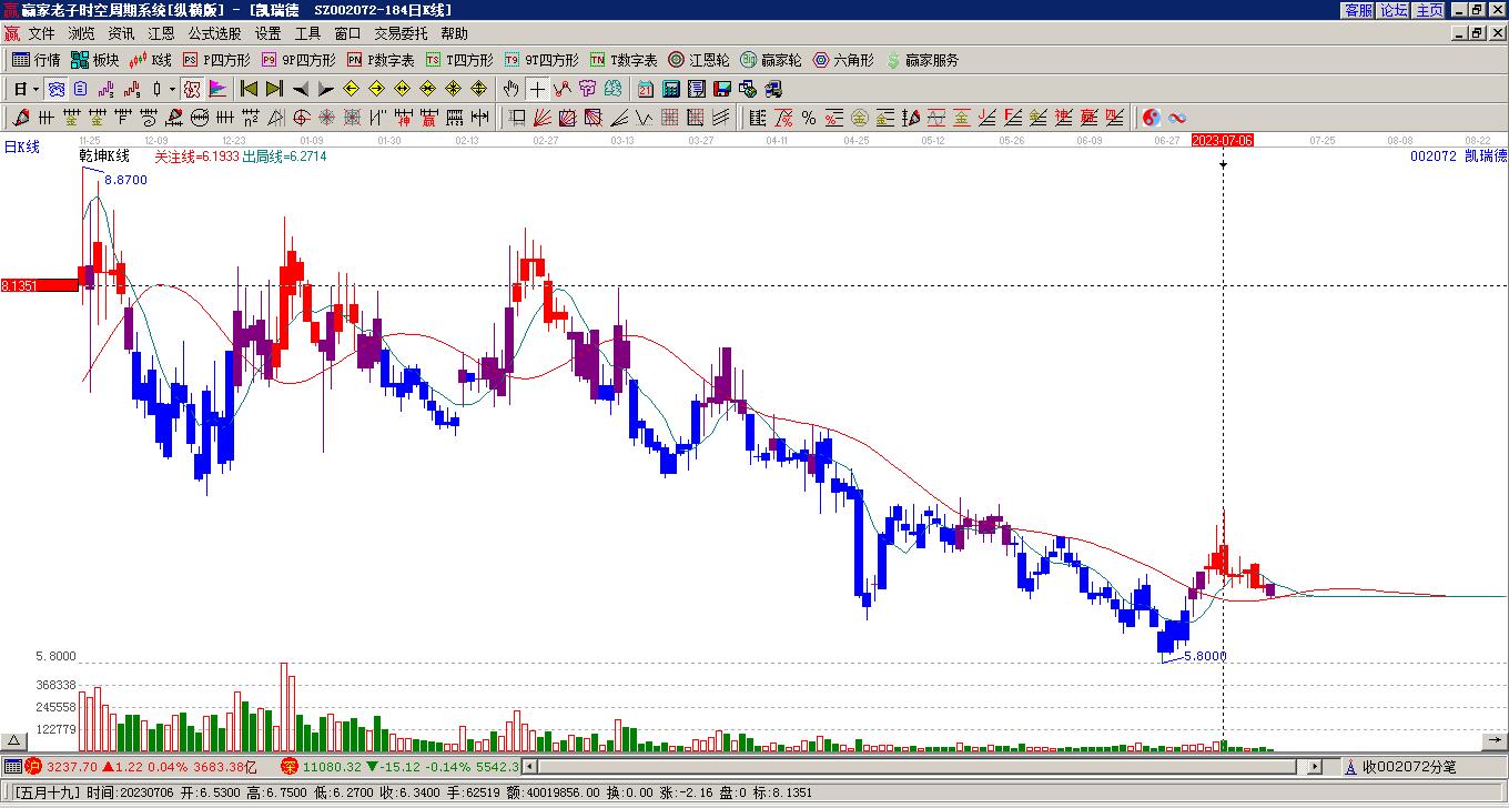 凱瑞德(002072)處于贏家江恩多頭中期回調(diào)形態(tài),今日雖重心下移,但短期多頭趨勢未改變,11月24日發(fā)出中期江恩筑底信號后,經(jīng)過8日,今日形成中期筑頂信號,若持續(xù)下跌,觸發(fā)長期筑頂信號,凱瑞德(00