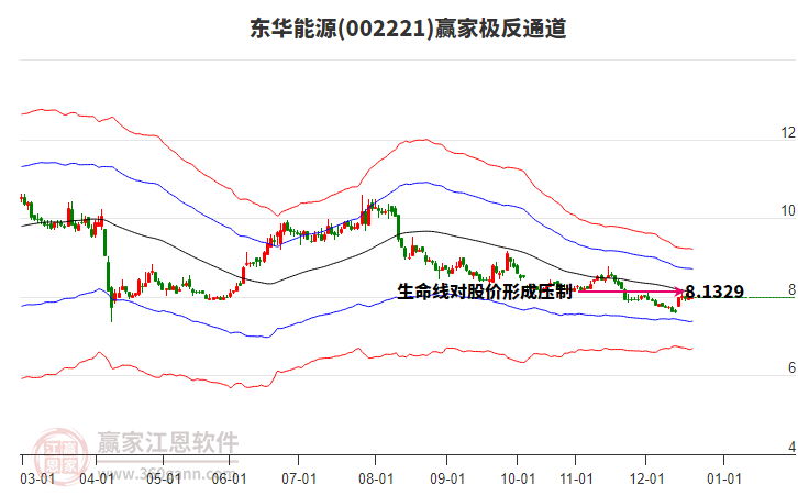依據(jù)贏家江恩系統(tǒng)趨勢(shì)工具極反通道分析判斷東華能源002221運(yùn)行在生命線以下弱勢(shì)區(qū)域,根據(jù)規(guī)則該股短線輕倉(cāng)參與,股價(jià)跌至弱勢(shì)外軌線后波段再結(jié)合其它工具信號(hào)建倉(cāng)。應(yīng)用口訣是:生命線上強(qiáng)勢(shì)走,生命線下難抬頭;紅黃兩條外軌線,壓力支撐顯勢(shì)頭。