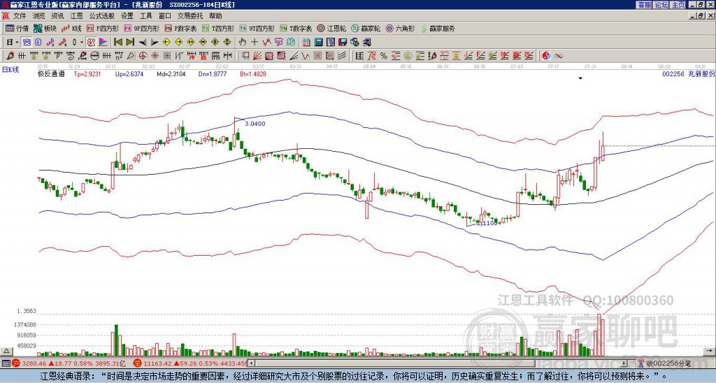 依據(jù)贏家江恩極反通道趨勢工具展示,本月股價處于生命線上強勢通道,本月月K線收盤價3.73,自近期通道內(nèi)高點4.37持續(xù)下跌至本月,到達生命線2.3943點上方,短期關(guān)注此線支撐,如支撐不破,保持在強勢通道內(nèi),波段繼續(xù)看多,有望再次挑戰(zhàn)藍色上軌線。若跌破生命線2.3943,進入弱勢通道,打開下跌空間。