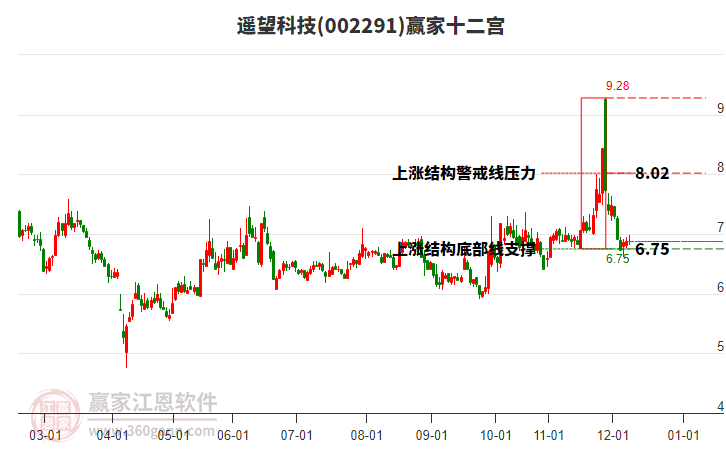 依據(jù)贏家江恩系統(tǒng)趨勢工具極反通道分析判斷遙望科技002291運行在生命線以下弱勢區(qū)域,根據(jù)規(guī)則該股短線輕倉參與,股價跌至弱勢外軌線后波段再結(jié)合其它工具信號建倉。應(yīng)用口訣是:生命線上強勢走,生命線下難抬頭;紅黃兩條外軌線,壓力支撐顯勢頭。
