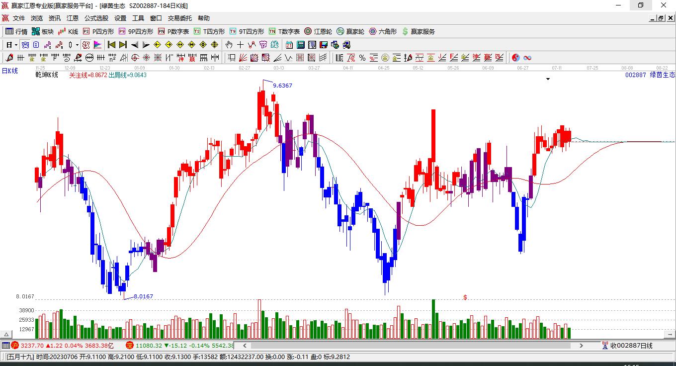 綠茵生態(tài)處于贏家江恩多頭次主線形態(tài),今日形成短期筑頂信號,短期多頭趨勢已被破壞,中期雖然處于回調(diào)中,但長期多頭趨勢延續(xù)。綠茵生態(tài)今日低開,截止目前微漲0.11%,K線為上影小陽線,形成反包,呈上漲走勢