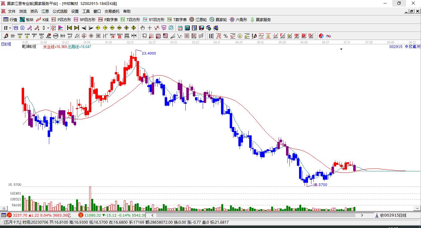 002915中欣氟材處于贏家江恩多頭中期回調(diào)形態(tài),從11月5日形成底分型后持續(xù)上攻,今日突破前高形成初次江恩筑底信號(hào),中長(zhǎng)線均在空頭下跌趨勢(shì)中。中欣氟材今日跳空高開(kāi),截止目前K線穿頭破腳中陽(yáng)線,上漲能