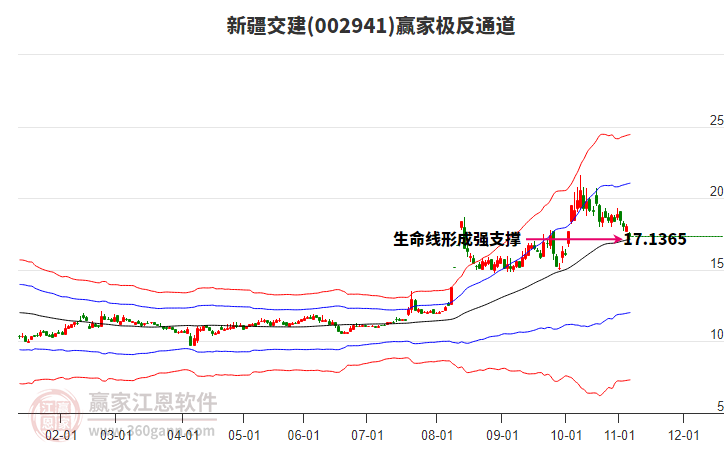 依據(jù)贏家江恩系統(tǒng)趨勢(shì)工具極反通道分析判斷新疆交建002941運(yùn)行在生命線以下弱勢(shì)區(qū)域,根據(jù)規(guī)則該股短線輕倉參與,股價(jià)跌至弱勢(shì)外軌線后波段再結(jié)合其它工具信號(hào)建倉。應(yīng)用口訣是:生命線上強(qiáng)勢(shì)走,生命線下難抬頭;紅黃兩條外軌線,壓力支撐顯勢(shì)頭。