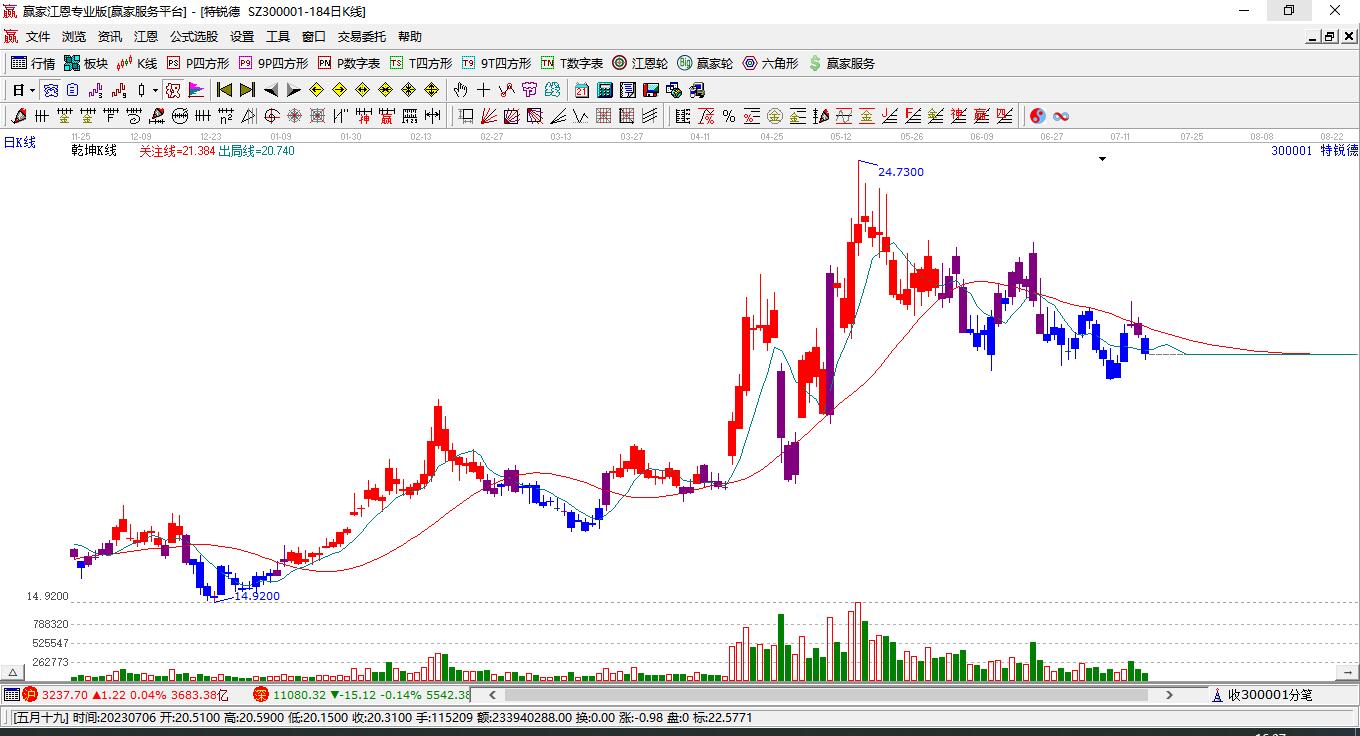 特銳德300001上漲遇阻 受藍色外軌線壓制 以穿頭破腳大陽線收盤