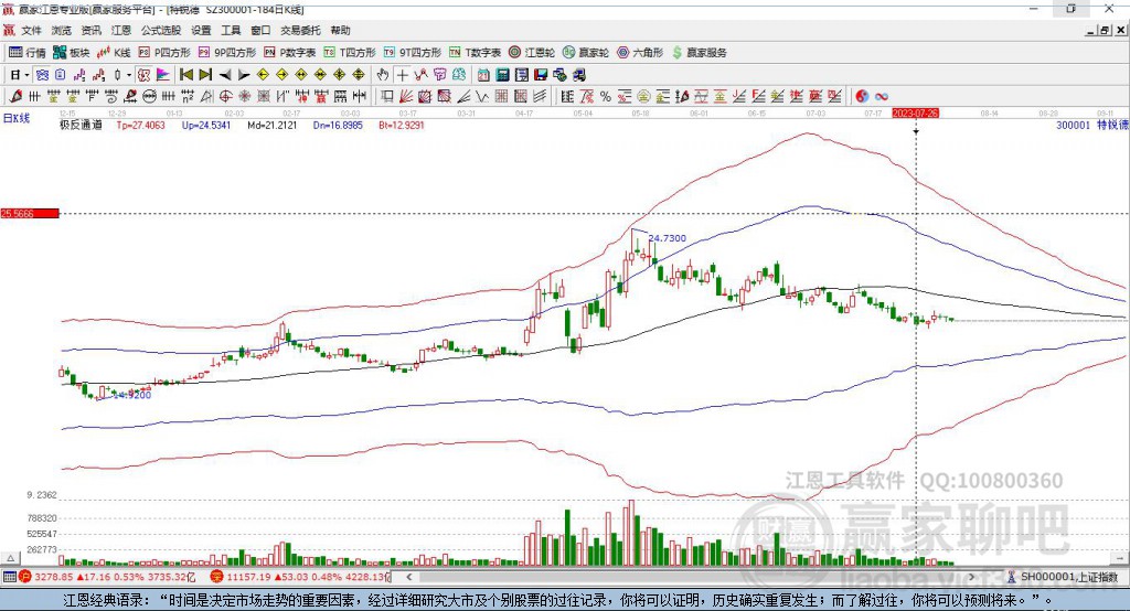 今天300001特銳德最高價32.19上穿了贏家極反通道工具上方紅色外軌線,受到上方紅色外軌線強力壓制,最終收盤停留在在上方紅色外軌線與藍色外軌線上方的超強通道區(qū)域。300001特銳德近10個交易日漲