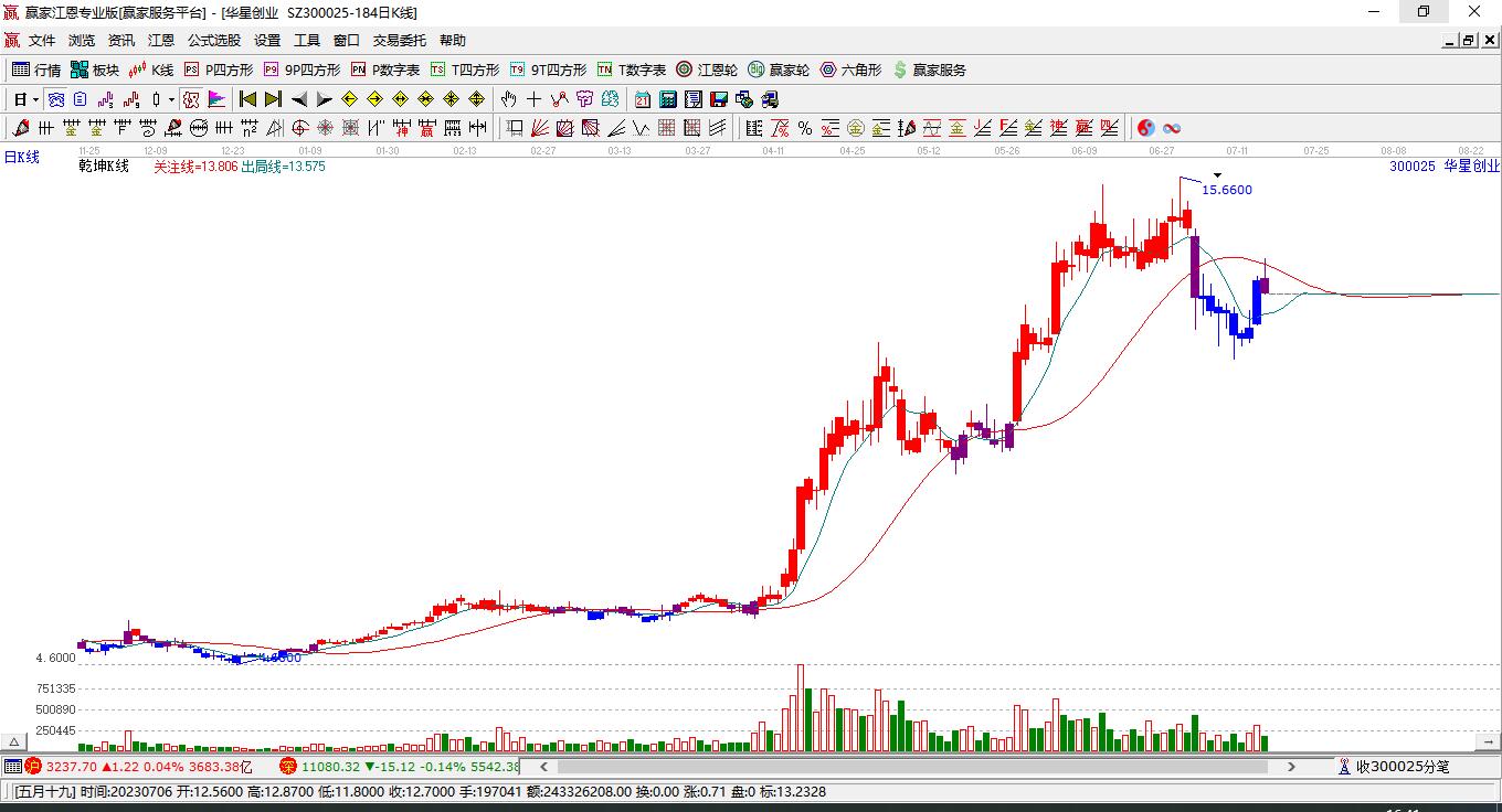 300025華星創(chuàng)業(yè)處于贏家江恩空頭主線形態(tài),從11月19日形成頂分型后持續(xù)下跌,今日形成短期初次筑頂信號,短期多頭趨勢已被破壞,中期多頭反彈趨勢延續(xù),但長期處于下跌中。300025華星創(chuàng)業(yè)根據(jù)贏家江