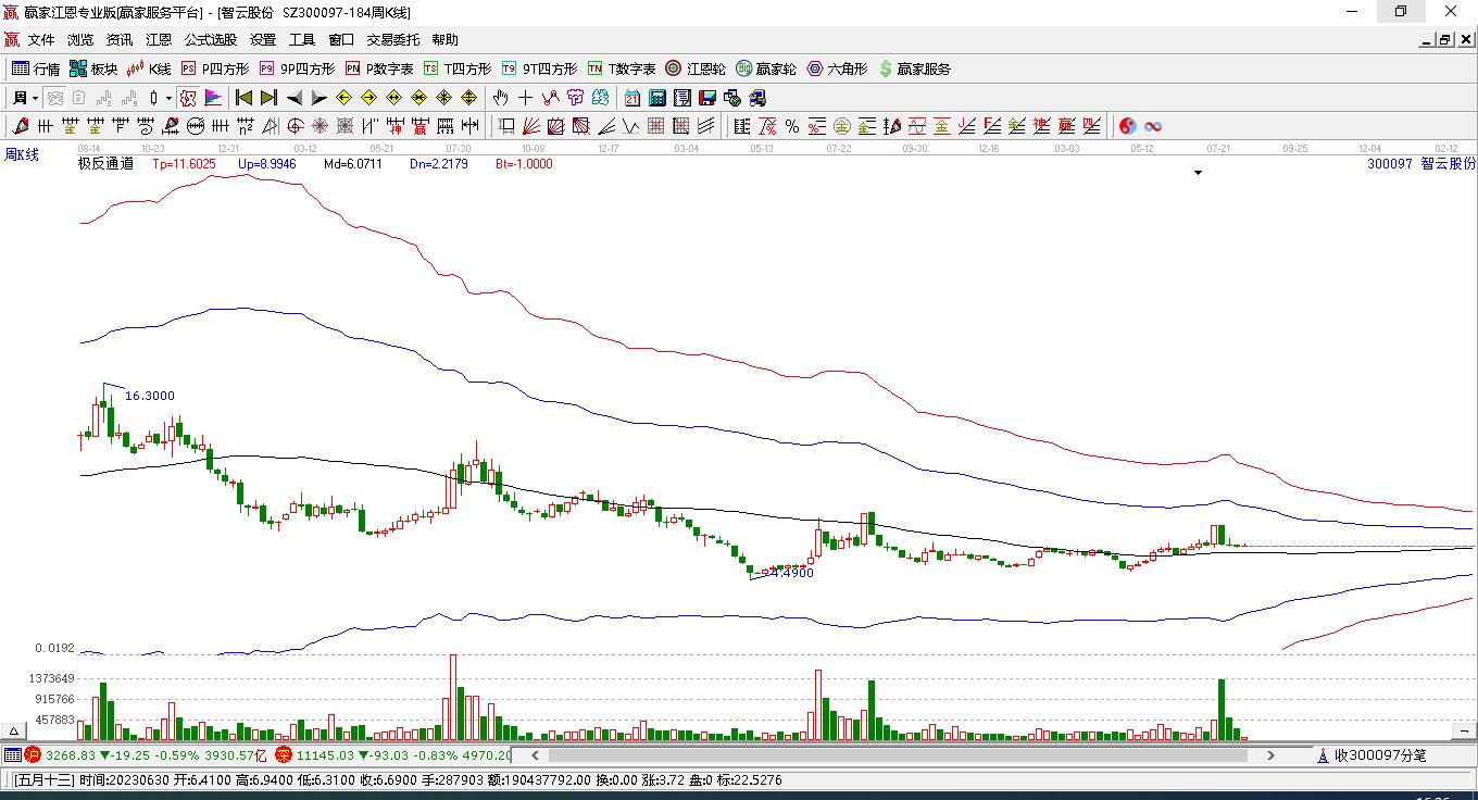 300097智云股份處于贏家江恩空頭主線形態(tài),從7月17日形成頂分型后持續(xù)下跌,今日形成短期初次筑頂信號,短期多頭趨勢已被破壞,中長期目前都處于反彈中。300097智云股份根據(jù)贏家江恩極反通道趨勢工具