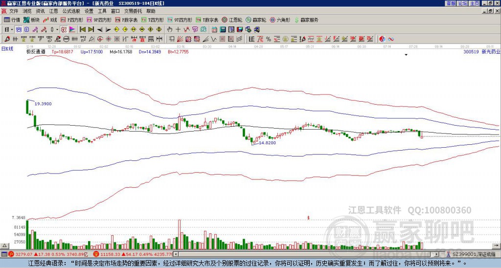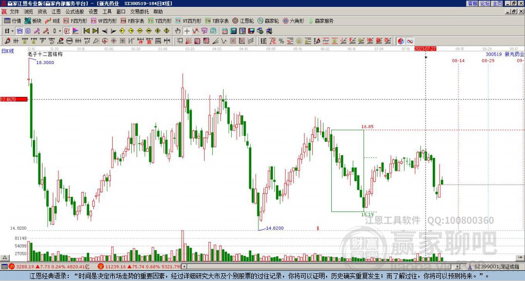 300519新光藥業(yè)處于贏家江恩多頭次主線形態(tài),從12月8日形成頂分型后持續(xù)下跌,重心下移,今日跌破前低形成短期初次筑頂信號(hào),短期多頭趨勢(shì)已被破壞,中期多頭趨勢(shì)延續(xù),但長(zhǎng)期處于回調(diào)中。300519新光