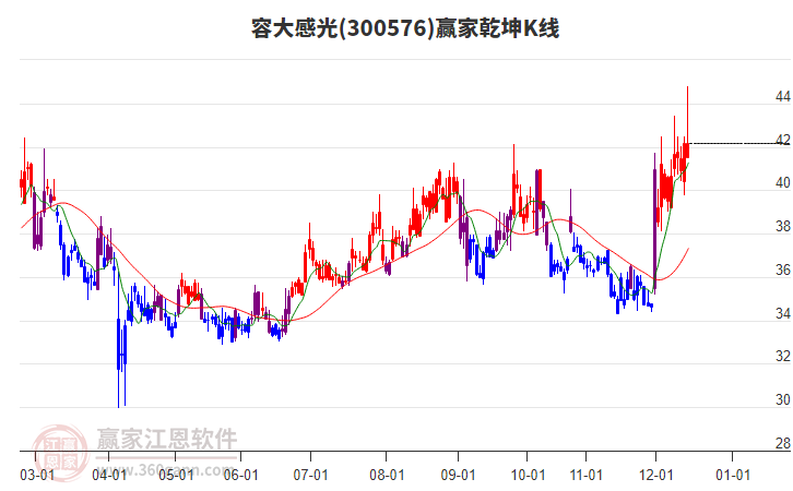 12月9日300576容大感光最高價(jià)43.44上穿了贏家極反通道工具藍(lán)色外軌線,受到藍(lán)色外軌線強(qiáng)力壓制,最終收盤(pán)停留在在藍(lán)色外軌線與生命線上方的強(qiáng)勢(shì)通道區(qū)域。300576容大感光近10個(gè)交易日漲幅16