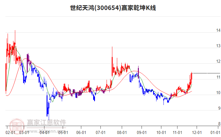 11月20日世紀(jì)天鴻300654上穿藍(lán)色外軌線 以上影小陽線收盤