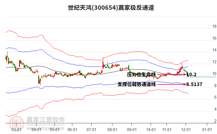 11月20日世紀(jì)天鴻300654最高價11.26上穿了贏家極反通道工具藍(lán)色外軌線,受到藍(lán)色外軌線強(qiáng)力壓制,最終收盤停留在在藍(lán)色外軌線與生命線上方的強(qiáng)勢通道區(qū)域。世紀(jì)天鴻300654近10個交易日漲幅4