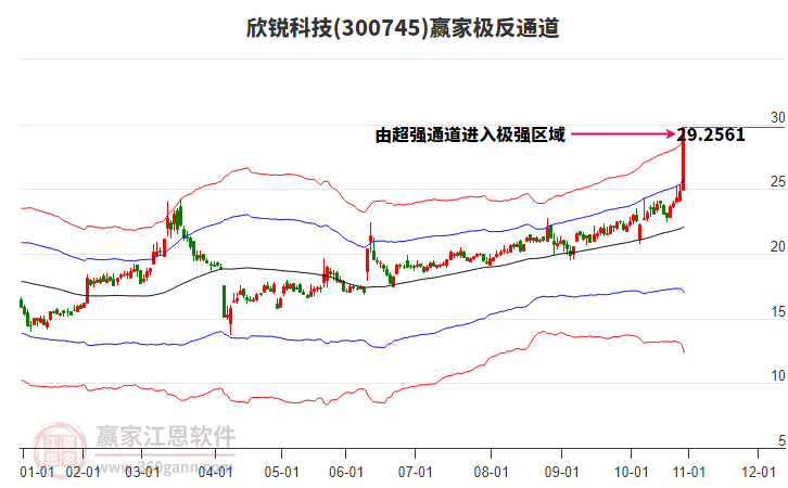 11月11日300745欣銳科技最高價(jià)28.72上穿了贏家極反通道工具藍(lán)色外軌線,受到藍(lán)色外軌線強(qiáng)力壓制,最終收盤停留在在藍(lán)色外軌線與生命線上方的強(qiáng)勢(shì)通道區(qū)域。300745欣銳科技近10個(gè)交易日漲幅1
