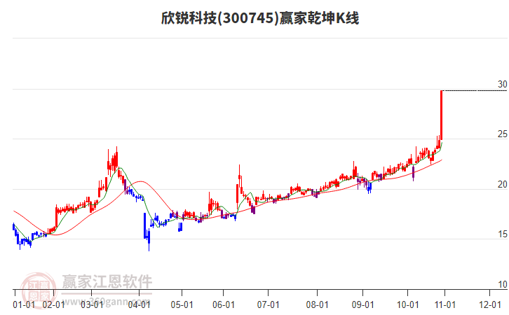 11月11日300745欣銳科技上穿藍(lán)色外軌線 以光腳長(zhǎng)上影小陽(yáng)線收盤