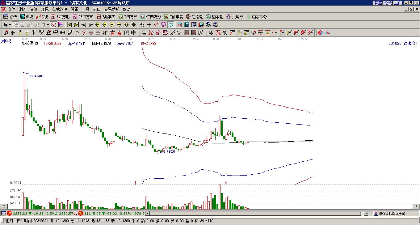 今天讀客文化最高價(jià)12.64挑戰(zhàn)了贏家極反通道工具上方紅色外軌線(xiàn),受到上方紅色外軌線(xiàn)強(qiáng)力壓制,最終收盤(pán)停留在在上方紅色外軌線(xiàn)與藍(lán)色外軌線(xiàn)上方的超強(qiáng)通道區(qū)域。讀客文化近10個(gè)交易日漲幅19.31%。