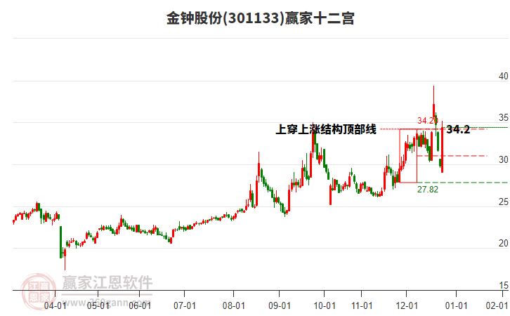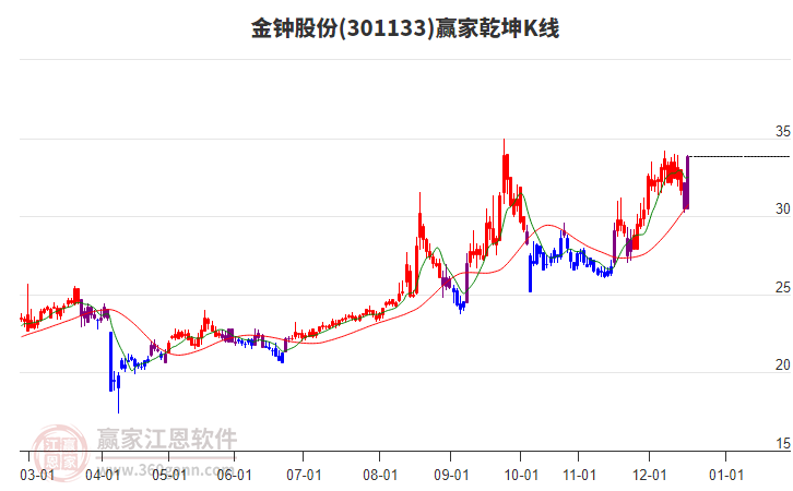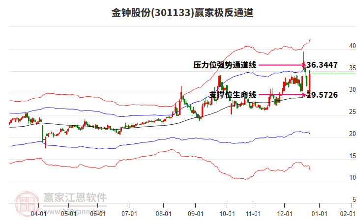 依據(jù)贏家江恩系統(tǒng)趨勢工具極反通道分析判斷金鐘股份301133運(yùn)行在生命線以下弱勢區(qū)域,根據(jù)規(guī)則該股短線輕倉參與,股價跌至弱勢外軌線后波段再結(jié)合其它工具信號建倉。應(yīng)用口訣是:生命線上強(qiáng)勢走,生命線下難抬頭;紅黃兩條外軌線,壓力支撐顯勢頭。