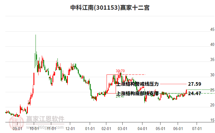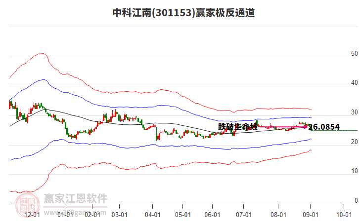 依據(jù)贏家江恩系統(tǒng)趨勢工具極反通道分析判斷中科江南301153運行在生命線以下弱勢區(qū)域,根據(jù)規(guī)則該股短線輕倉參與,股價跌至弱勢外軌線后波段再結(jié)合其它工具信號建倉。應用口訣是:生命線上強勢走,生命線下難抬頭;紅黃兩條外軌線,壓力支撐顯勢頭。