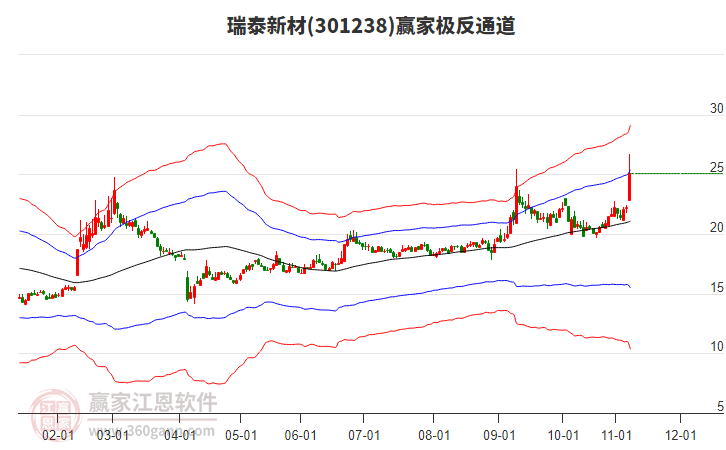 今天瑞泰新材301238最高價(jià)26.7上穿了贏家極反通道工具藍(lán)色外軌線,受到藍(lán)色外軌線強(qiáng)力壓制,最終收盤停留在在藍(lán)色外軌線與生命線上方的強(qiáng)勢(shì)通道區(qū)域。瑞泰新材301238近10個(gè)交易日漲幅21.87%