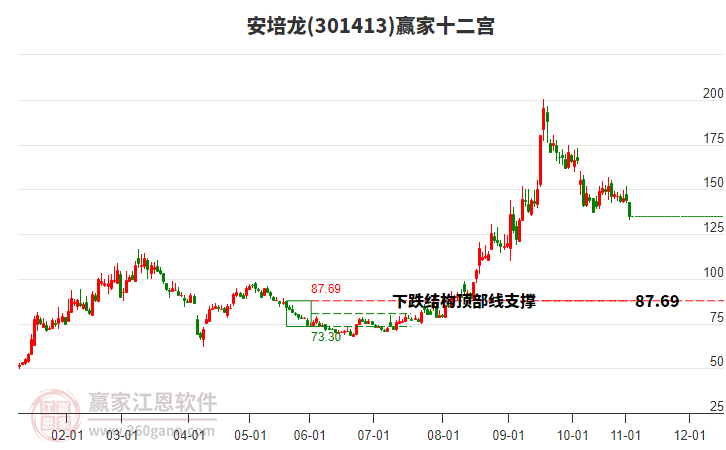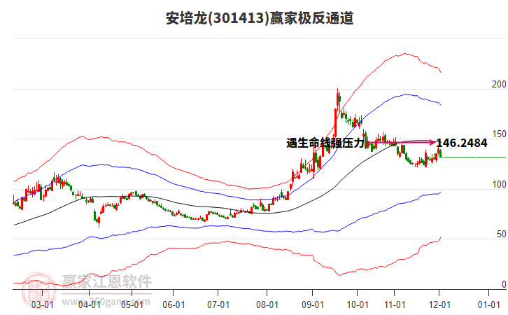 9月8日301413安培龍最高價(jià)152.0上穿了贏家極反通道工具上方紅色外軌線,受到上方紅色外軌線強(qiáng)力壓制,最終收盤(pán)停留在在上方紅色外軌線與藍(lán)色外軌線上方的超強(qiáng)通道區(qū)域。301413安培龍近10個(gè)交易