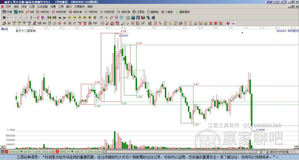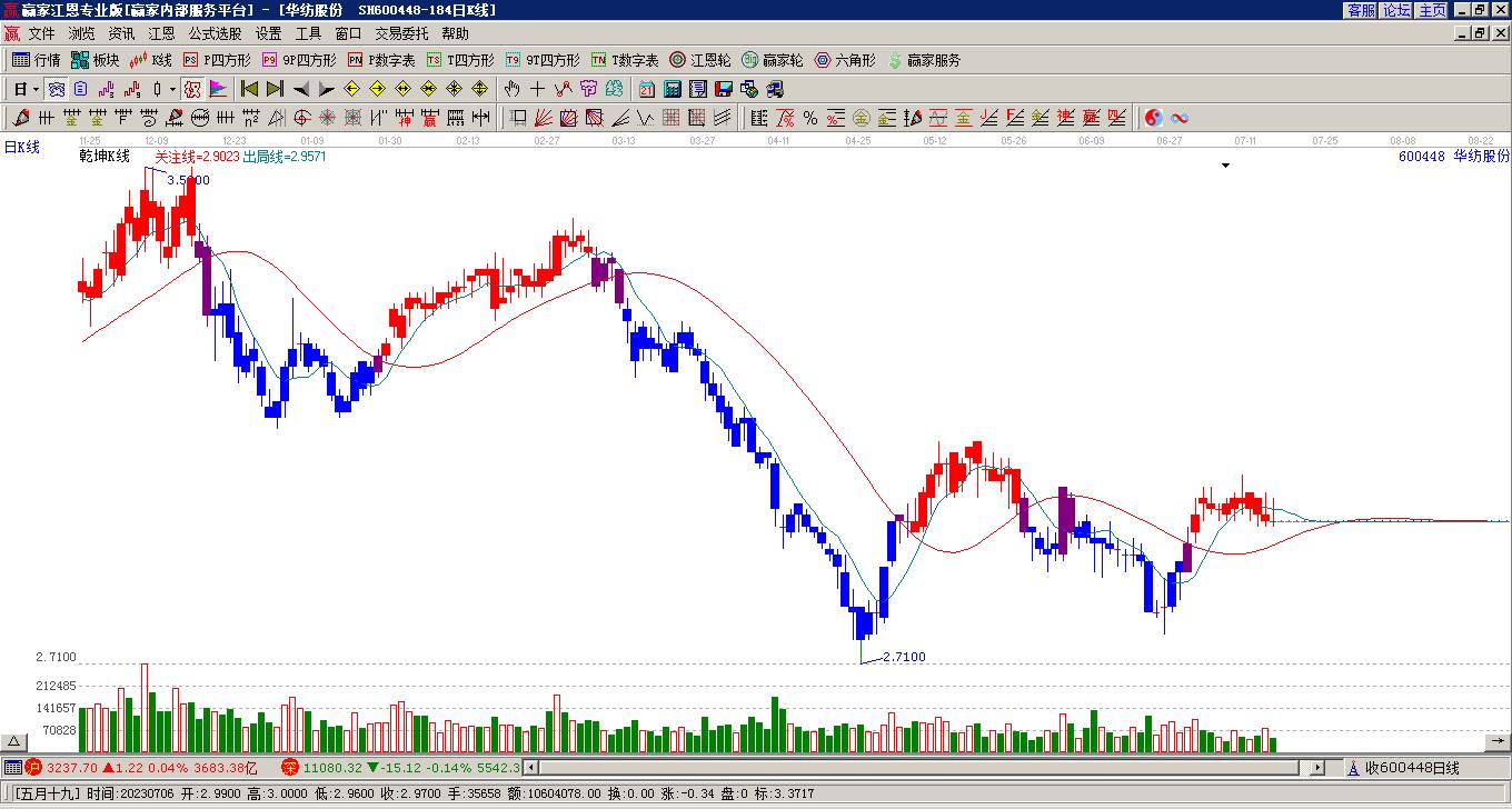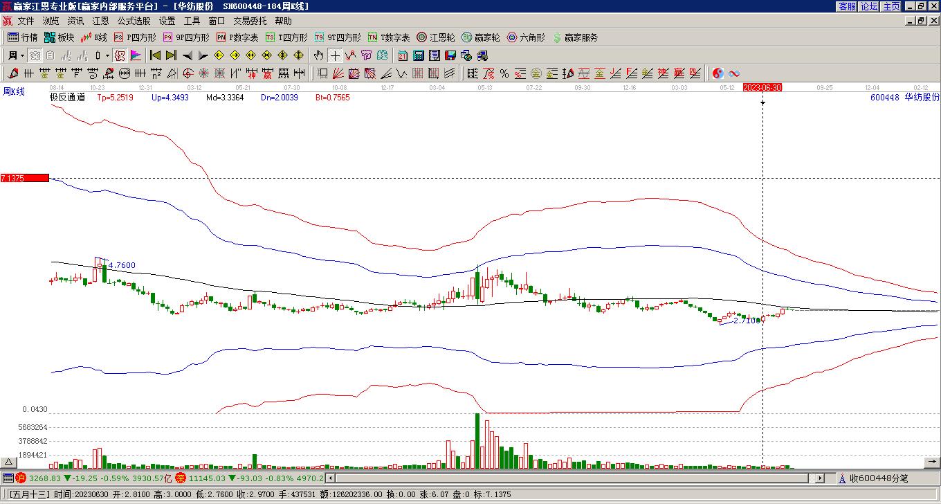 600448華紡股份處于贏家江恩多頭中期回調(diào)形態(tài),9月3日發(fā)出江恩筑底信號后,經(jīng)過71日,今日形成短期筑頂信號,短期多頭趨勢已被破壞,中長期多頭趨勢依舊保持。600448華紡股份根據(jù)贏家江恩極反通道趨