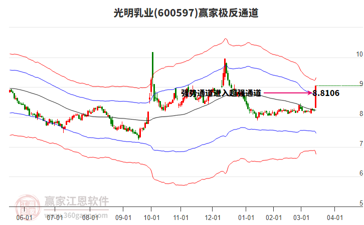 依據(jù)贏家江恩系統(tǒng)趨勢工具極反通道分析判斷光明乳業(yè)600597運行在生命線以下弱勢區(qū)域,根據(jù)規(guī)則該股短線輕倉參與,股價跌至弱勢外軌線后波段再結(jié)合其它工具信號建倉。應(yīng)用口訣是:生命線上強勢走,生命線下難抬頭;紅黃兩條外軌線,壓力支撐顯勢頭。