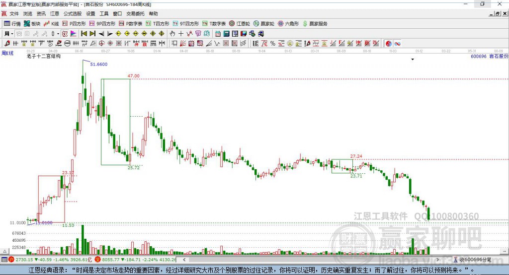 *ST巖石(600696)處于贏家江恩空頭主線形態(tài),8月20日發(fā)出江恩筑底信號后,經(jīng)過113日,今日形成短期筑頂信號,短期多頭趨勢已被破壞,中長線均在空頭下跌趨勢中。*ST巖石(600696)根據(jù)贏家
