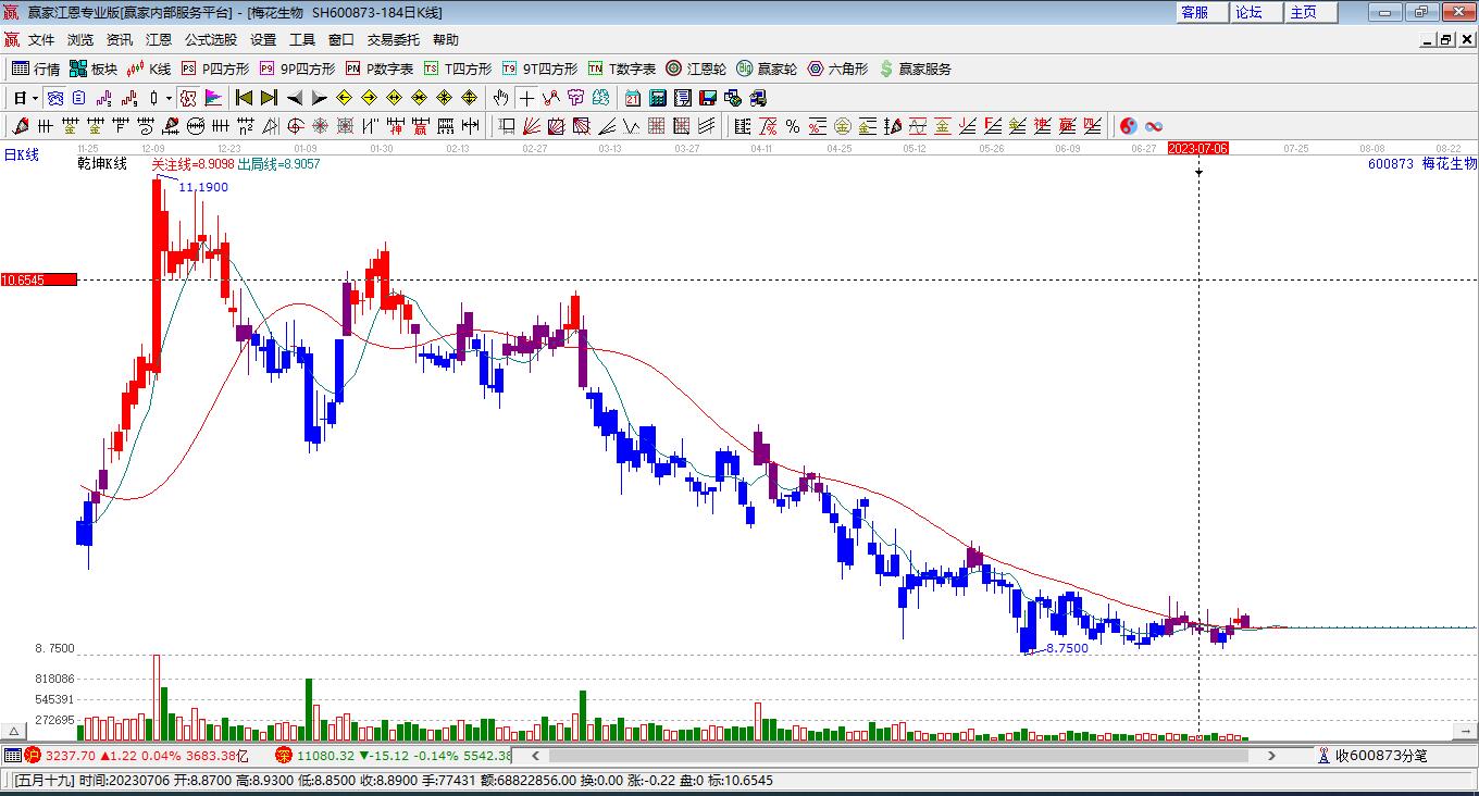 梅花生物近期高點(diǎn)11.64持續(xù)下跌,漲幅回落16.17%,受贏家十二宮下跌結(jié)構(gòu)底部線支撐