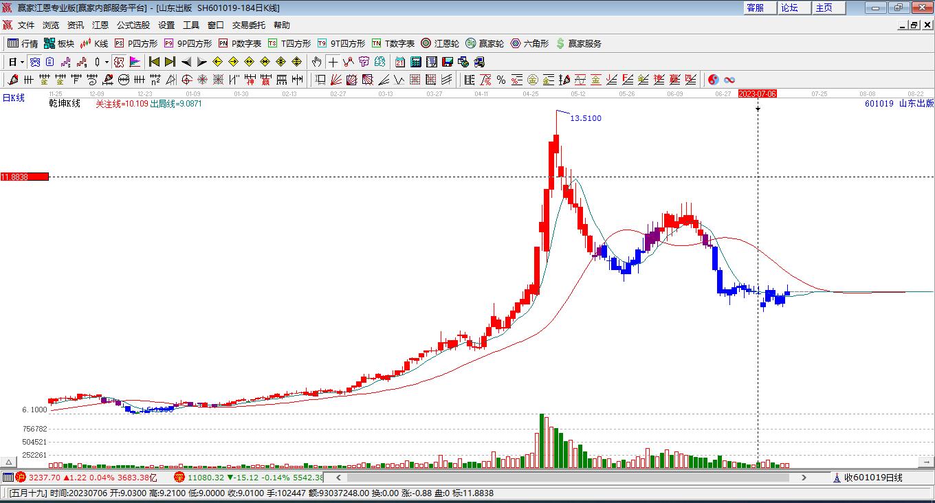 當天山東出版601019最高價8.84上穿了贏家極反通道工具藍色外軌線,受到藍色外軌線強力壓制,最終收盤停留在在藍色外軌線與生命線上方的強勢通道區(qū)域。山東出版601019近10個交易日漲幅12.58%