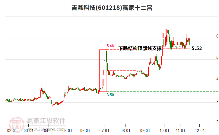 吉鑫科技根據(jù)贏家江恩極反通道趨勢(shì)工具展示,上方壓力位5.4216,下方支撐位3.5971。吉鑫科技處于贏家江恩多頭次主線(xiàn)形態(tài),從11月11日形成頂分型后持續(xù)下跌,重心下移,今日跌破前低形成短期初次筑頂
