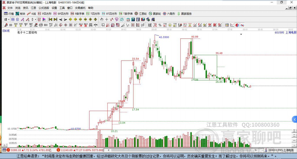 601595上海電影上漲遇阻 受藍(lán)色外軌線壓制 以光腳長(zhǎng)上影小陽線收盤