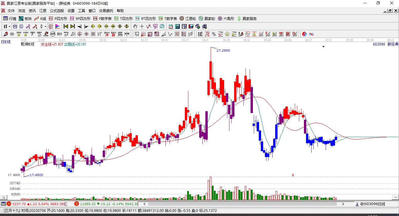 依據(jù)贏家江恩乾坤K線工具展示,目前股價處于藍(lán)色區(qū)域,本周K線以陽線收盤,周K線收于出局線下方。近期前方高點11月14日19.2點,如短期有效突破前期高點19.2,有望走出震蕩區(qū)域,如不能突破,繼續(xù)延續(xù)箱體震蕩。