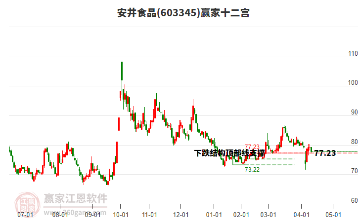 依據(jù)贏家江恩系統(tǒng)趨勢工具極反通道分析判斷安井食品603345運行在生命線以下弱勢區(qū)域,根據(jù)規(guī)則該股短線輕倉參與,股價跌至弱勢外軌線后波段再結(jié)合其它工具信號建倉。應(yīng)用口訣是:生命線上強勢走,生命線下難抬頭;紅黃兩條外軌線,壓力支撐顯勢頭。