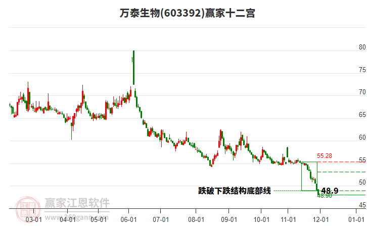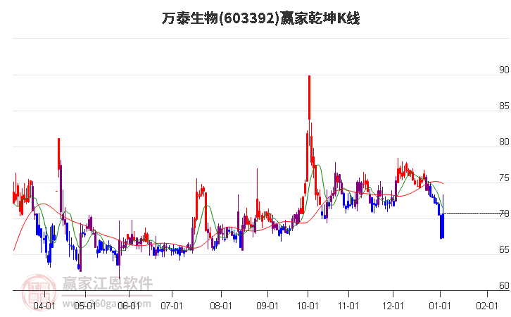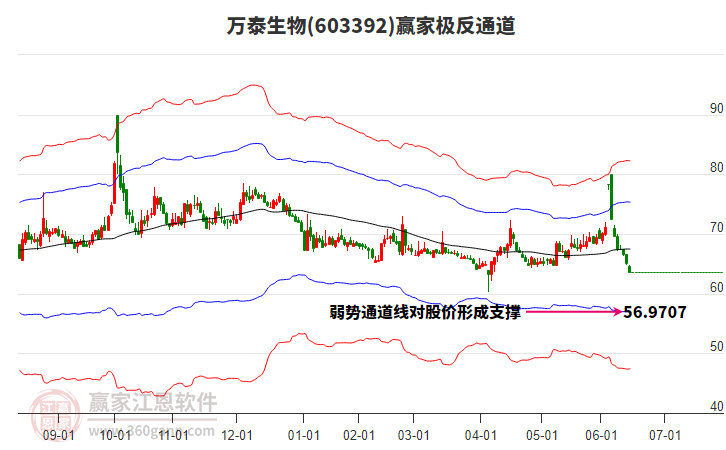 依據(jù)贏家江恩系統(tǒng)趨勢工具極反通道分析判斷萬泰生物603392運行在生命線以下弱勢區(qū)域,根據(jù)規(guī)則該股短線輕倉參與,股價跌至弱勢外軌線后波段再結(jié)合其它工具信號建倉。應(yīng)用口訣是:生命線上強勢走,生命線下難抬頭;紅黃兩條外軌線,壓力支撐顯勢頭。