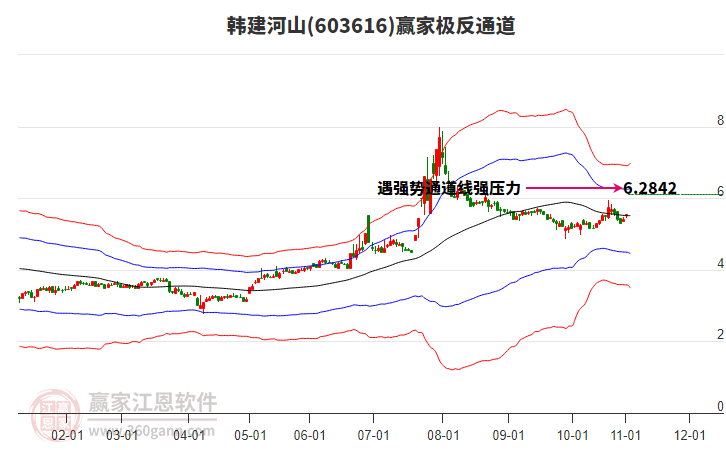 韓建河山今日一字板漲停,受極反通道強(qiáng)勢(shì)通道線(xiàn)壓制