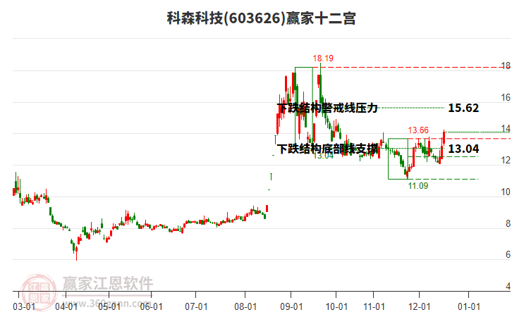 當前股價位于前期2025年9月15日形成的下跌結構頂部線18.19與警戒線15.62之間,該股自近期低點12.06,漲至今日15.63,共上漲3.57元,漲幅29.6%。依據贏家十二宮多空能量守恒規(guī)則,下跌結構警戒線是多空能量平衡爭奪點,突破或跌破往往意味著平衡打破。當前股價若能站穩(wěn)警戒線位置,多方能量有望主導上攻,向上頂部線位置尋找多空能量平衡位。如股價不能有效站穩(wěn)警戒線,則空方能量主導下探,向底部線附近尋找新的多空能量平衡位。