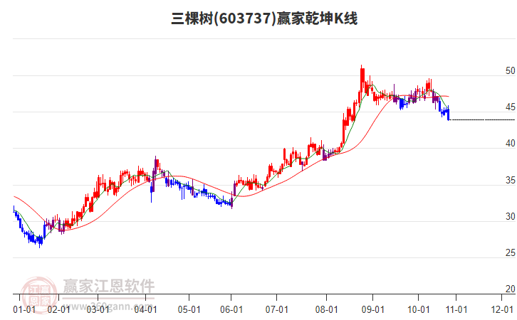 三棵樹近期高點(diǎn)49.65持續(xù)下跌,漲幅回落12.99%,跌破黃金價格回調(diào)支撐位工具關(guān)鍵點(diǎn)位48.07元
