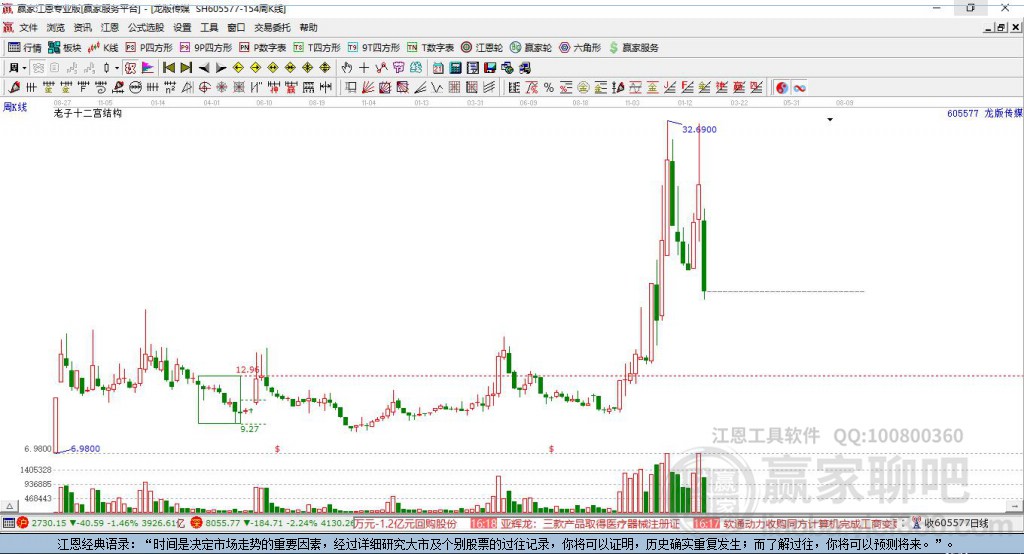 龍版?zhèn)髅?605577)處于贏家江恩空頭中期反彈形態(tài),10月30日發(fā)出江恩筑底信號(hào)后,經(jīng)過(guò)18日,今日形成短期筑頂信號(hào),短期多頭趨勢(shì)已被破壞,中長(zhǎng)期多頭趨勢(shì)依舊保持。龍版?zhèn)髅浇袢盏烷_(kāi)后持續(xù)下跌,截止目