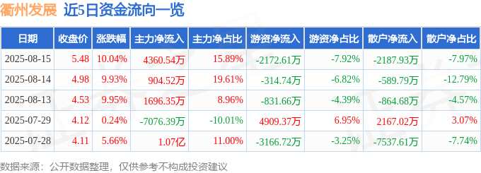 摘要: 消息,衢州發(fā)展8月15日漲停收盤,收盤價(jià)5.48元。該股于9點(diǎn)25分漲停,未打開漲停,截止收盤封單資金為5.78億元,占其流通市值1.24%。8月15日的資金流向數(shù)據(jù)方面,