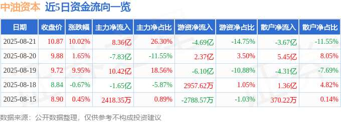 消息,中油資本8月21日漲停收盤(pán),收盤(pán)價(jià)10.87元。該股于9點(diǎn)30分漲停,2次打開(kāi)漲停,截止收盤(pán)封單資金為4.35億元,占其流通市值0.32%。