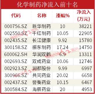 化學(xué)制藥板塊今日集體大漲,流入前十名中有9只漲幅超過10CM,機(jī)構(gòu)資金流入過億元的個(gè)股有6只,最多的是新華制藥(000756),凈流入3.82億元。