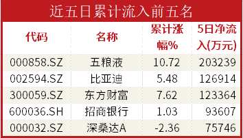 近5日累計(jì)流入前5位為五糧液(000858)、比亞迪(002594)、東方財(cái)富(300059)、招商銀行與【深桑達(dá)A(000032)、股吧】。