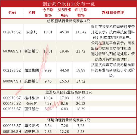 今日新高股有23只,從行業(yè)分布看,紡織服裝家數(shù)最多,有4只新高股,其中安奈兒(002875)、如意集團(tuán)(002193)與新澳股份(603889)均是近期涉及抗菌面料概念而被游資大肆炒作,龍頭股安奈兒近 10個(gè)交易日有8天漲停,如意集團(tuán)則是在上周五剛剛啟動(dòng),連續(xù)4天漲停。旅游行業(yè)有3只新高股,其中桂林旅游與【麗江股份(002033)、股吧】(002033)連續(xù)兩天創(chuàng)新高。另外環(huán)境治理有2只個(gè)股創(chuàng)新高。