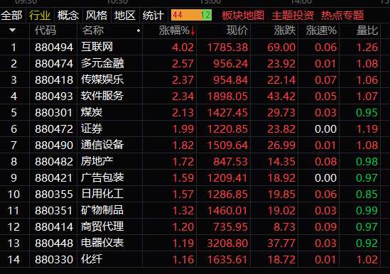 板塊方面:互聯(lián)網(wǎng)板塊反彈幅度最大,漲幅超過4%,傳媒娛樂、軟件服務(wù)、煤炭、券商等板塊整體漲幅超過2%,通信、房地產(chǎn)、日化等板塊漲幅居前;