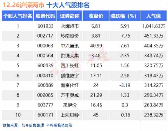 12月26日滬深兩市雙雙收漲,成交量變化不大。板塊上電源設(shè)備、元件漲幅居前,電力、銀行跌幅居前。人氣股方面新股中興通訊、永輝超市(601933)漲幅居前,嶺南股份(002717)、南京化纖(600889)跌幅居前。下面是今日十大人氣股排名的詳細(xì)情況。