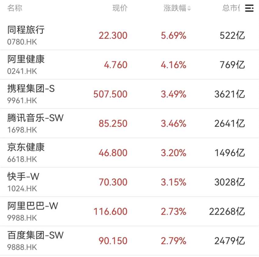 港股方面,恒生科技指數(shù)漲超1%,同程旅行、阿里健康、攜程集團(tuán)等漲幅居前。